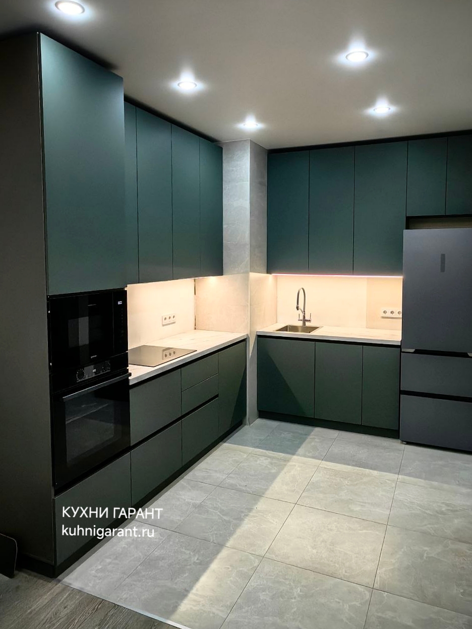 Кухня выполнена в долговечных прочных и пластичных фасадах двухстороннего nano-пластика.