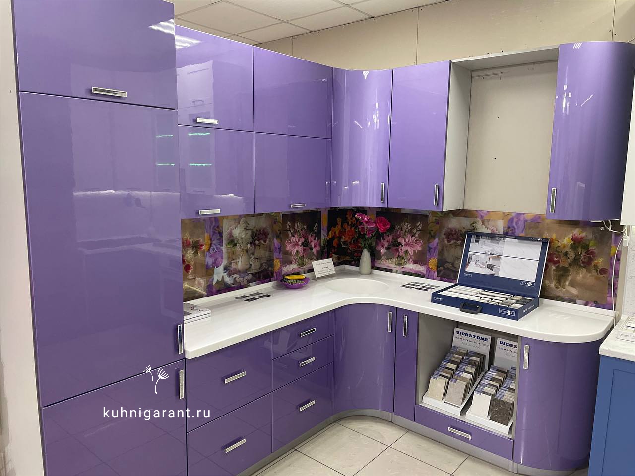 Глубокий фиолетовый цвет с оттенком металлик говорит об очень интересном духовном мире хозяев, дает женщине чувство, что она любима. С идеально подобранной стеновой панелью в виде цветов на Вашей кухне всегда будет ощущение праздника. Хорошо подходит для молодой семьи, а также для молодой прекрасной девушки. Эта кухня - идеальный подарок.