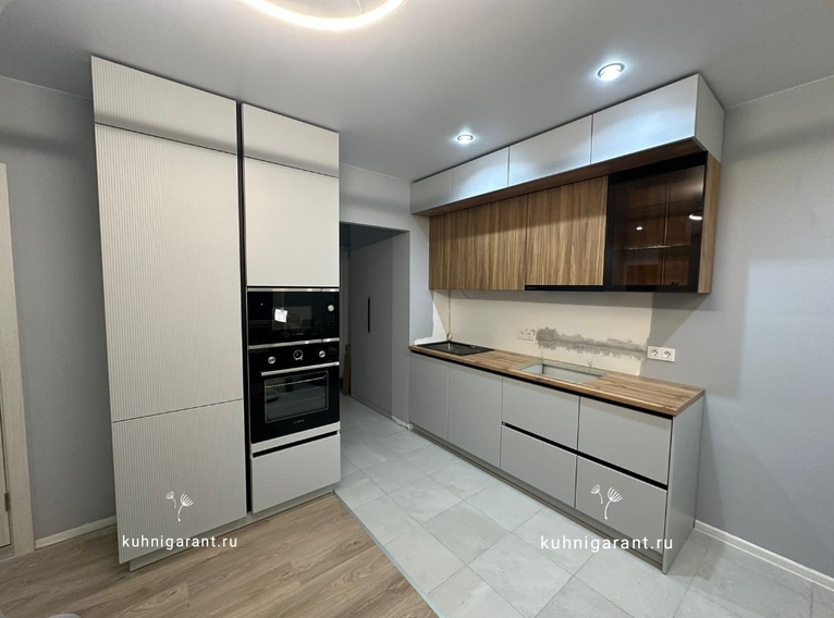 Кухня выполнена в трех видах фасадов: ЭМАЛЬ МАТОВАЯ ГЛАДКАЯ, ЭМАЛЬ МАТОВЯ С РИФЛЕН6ИЕМ, ПОД ДЕРЕВО- ПЛАСТИК ДВУХСТОРОННИЙ. Основа всех фасадов МДФ. Столешница использована российская пластиковая. Усиления для ящиков "Премиум" категории, но не самые дорогие - это тандембоксы Boyard, петли все с доводчиками. Цоколь мдф-эмаль выкрашен в цвет фасадов. Витрина со стеклом имеет тонкую рамку снаружи и широкую внутри - такой дизайн рамки выбран клинтом из двух возможных, внури витрины - подстветка в паз. Так же на кухне присутствуют 2 боковых торцевых фасада в эмали мат, как и вся кухня.