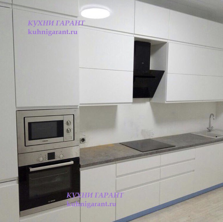 Модель кухни выполненна в эмали глянец, но не в обычной фрезеровке без фрезы, а с фрезерованной фучкой в верхней части каждого фасада.